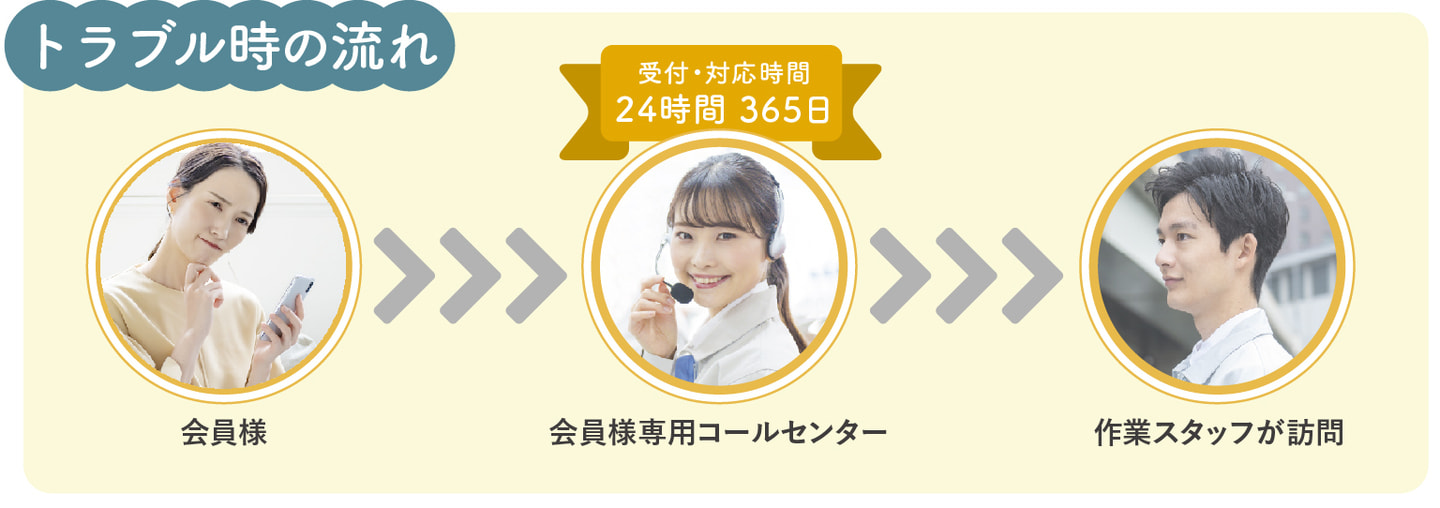 日常生活における小さなトラブルから大きなトラブルまで、緊急時に24時間365日体制で専門知識をもったスタッフがサポートいたします。トイレの詰まりや水漏、お湯が出ないなどの住宅トラブルでお困りの際は、お気軽にお電話ください。